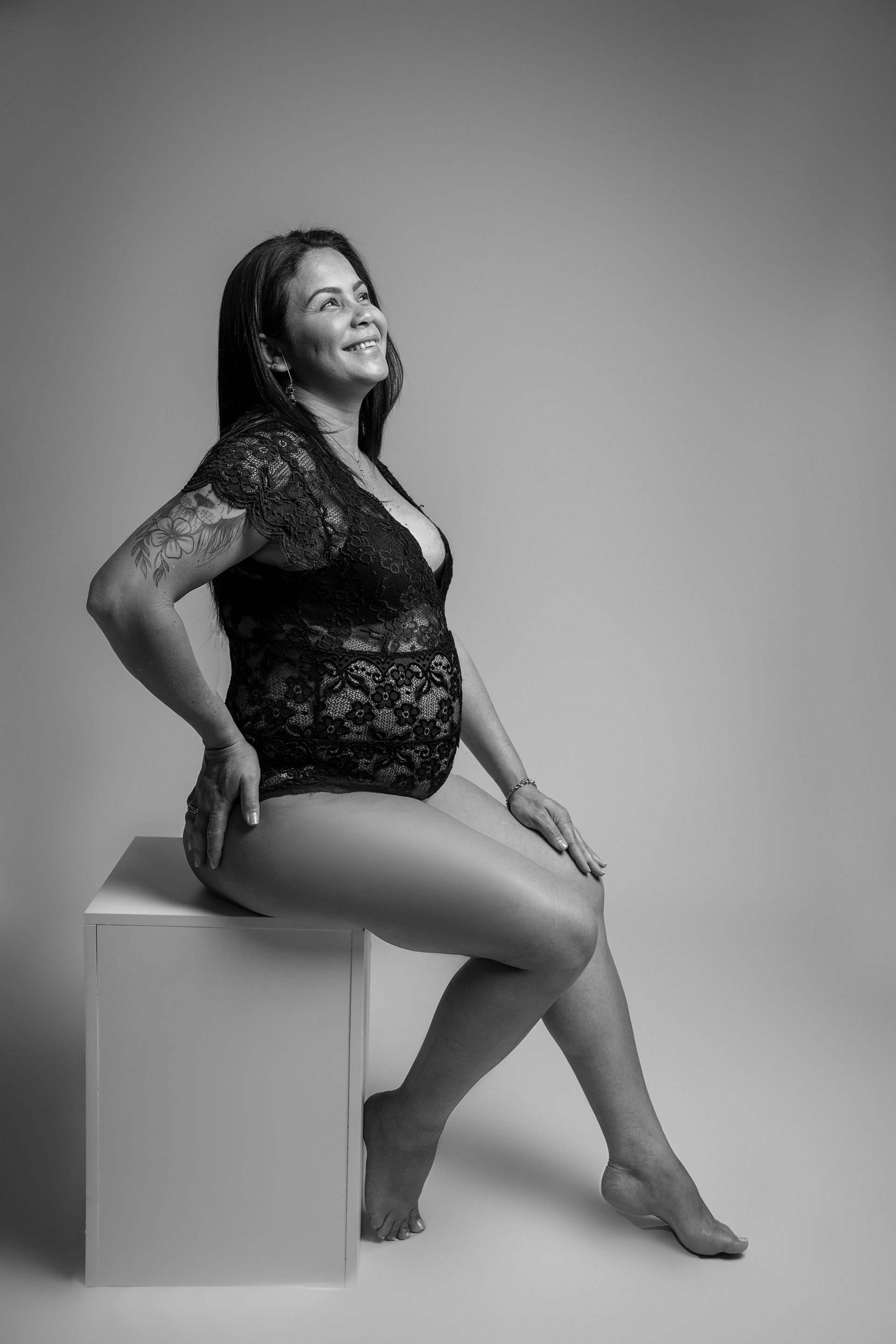 Melhor custo-benefício — Pacote mais contratado -Para quem busca um ensaio luminoso e radiante, este pacote inclui 50 minutos de sessão em estúdio, um figurino elegante, fundo claro ou escuro ou neutro, 20 fotos digitais em alta resolução que capturam a beleza e o brilho natural da gestante e 5 fotos impressas tamanho retrato grande.